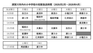 放送時間につきましては、学校ごとに決められた放送時間帯に放送されますので、校歌の放送時間につきましては表にてご確認ください。